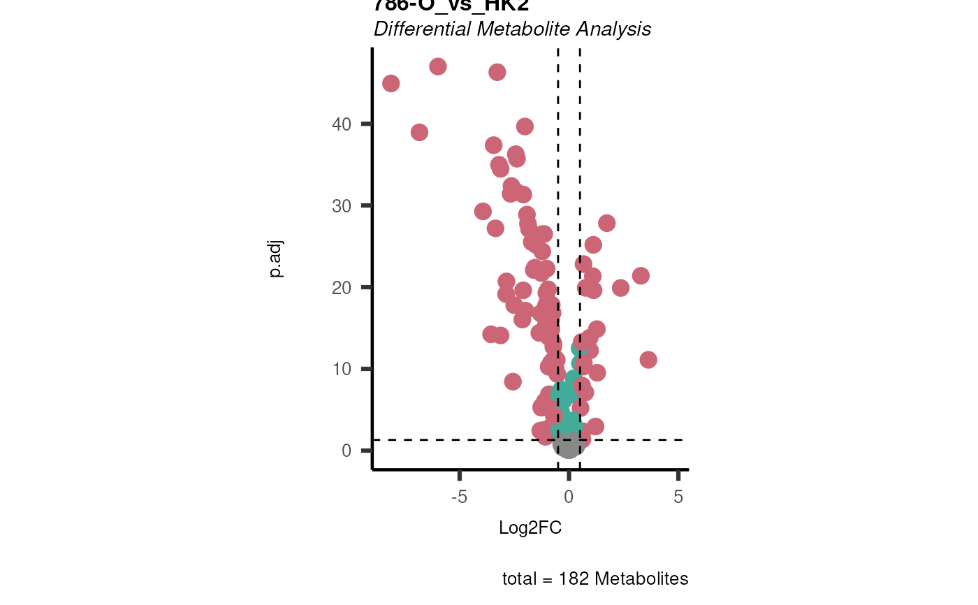 #> Warning: data_c1 includes NAs in Log2FC and/or in p.adj. 1 metabolites containing NAs are removed.