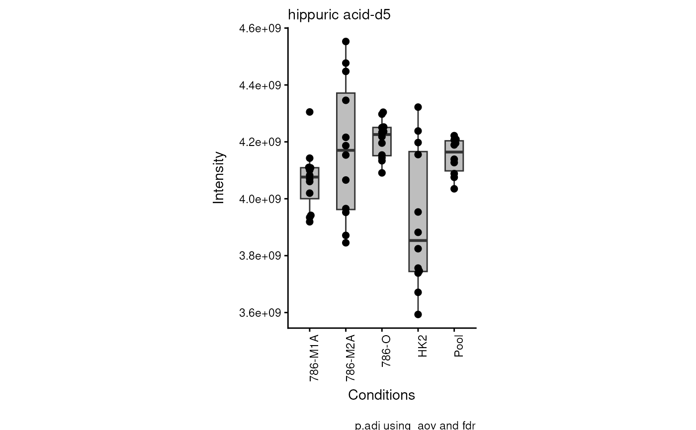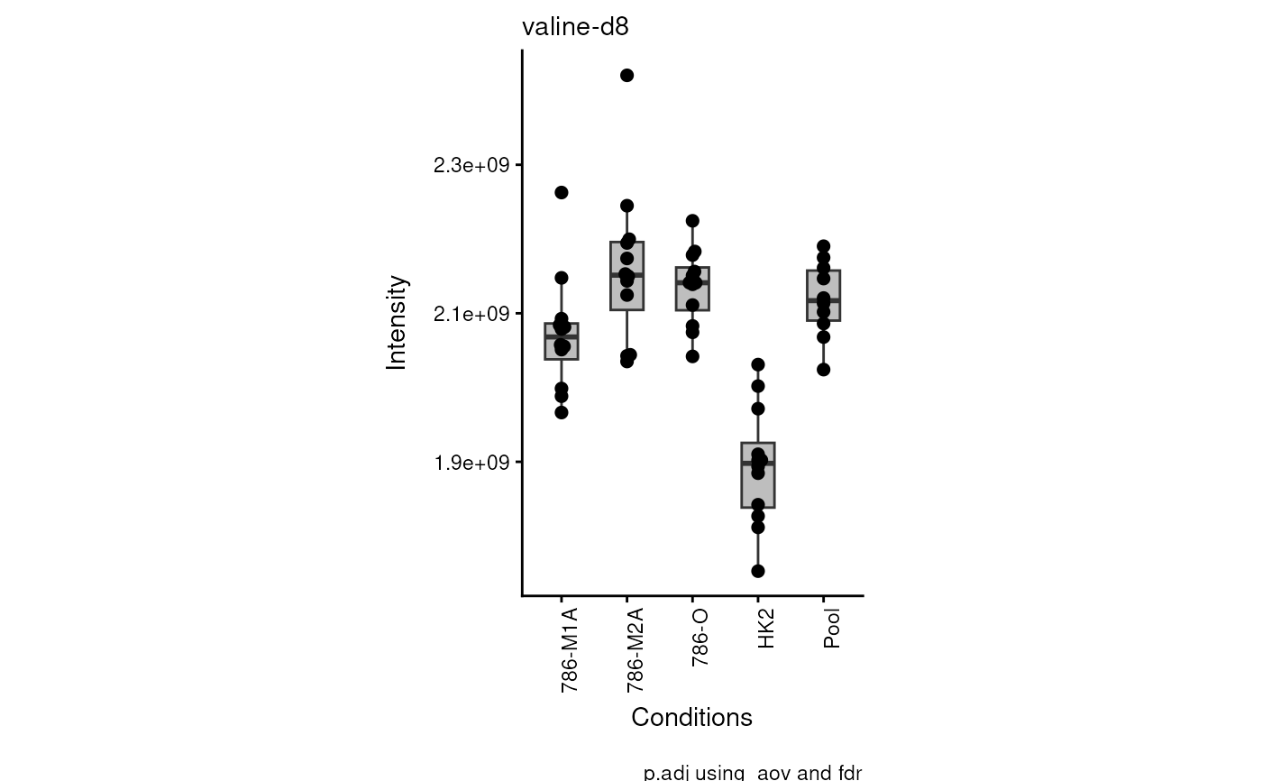 Optional: String which contains an abbreviation of the selected test to calculate p.value. For one-vs-one comparisons choose t.test or wilcox.test , for one-vs-all or all-vs-all comparison choose aov (=anova) or kruskal.test Default = NULL